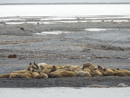 We were at Moffen, a small island north of the mouth of Wijdefjorden that looks more like a glorified sandbar but which is an important haul-out area for walrus and a nesting site for birds. We quickly grabbed our boots, hats and jackets and went outside to see a group of 30 or 40 walruses all piled together on the gravel beach; they are highly gregarious creatures and they love to congregate in highly congested groups with individuals lying on top of each other. We could easily see the long tusks of several large males and the slightly smaller ones of the females, as well as the tiny little tusks of the young walruses that were in the water in front of the main group. Walruses are big animals and one of the largest pinnipeds in the world, with large males weighing up to 4,200lbs; they are frequently seen in Svalbard and we encountered several isolated individuals during the last few days, but at Moffen we had our first opportunity to watch their real social nature.