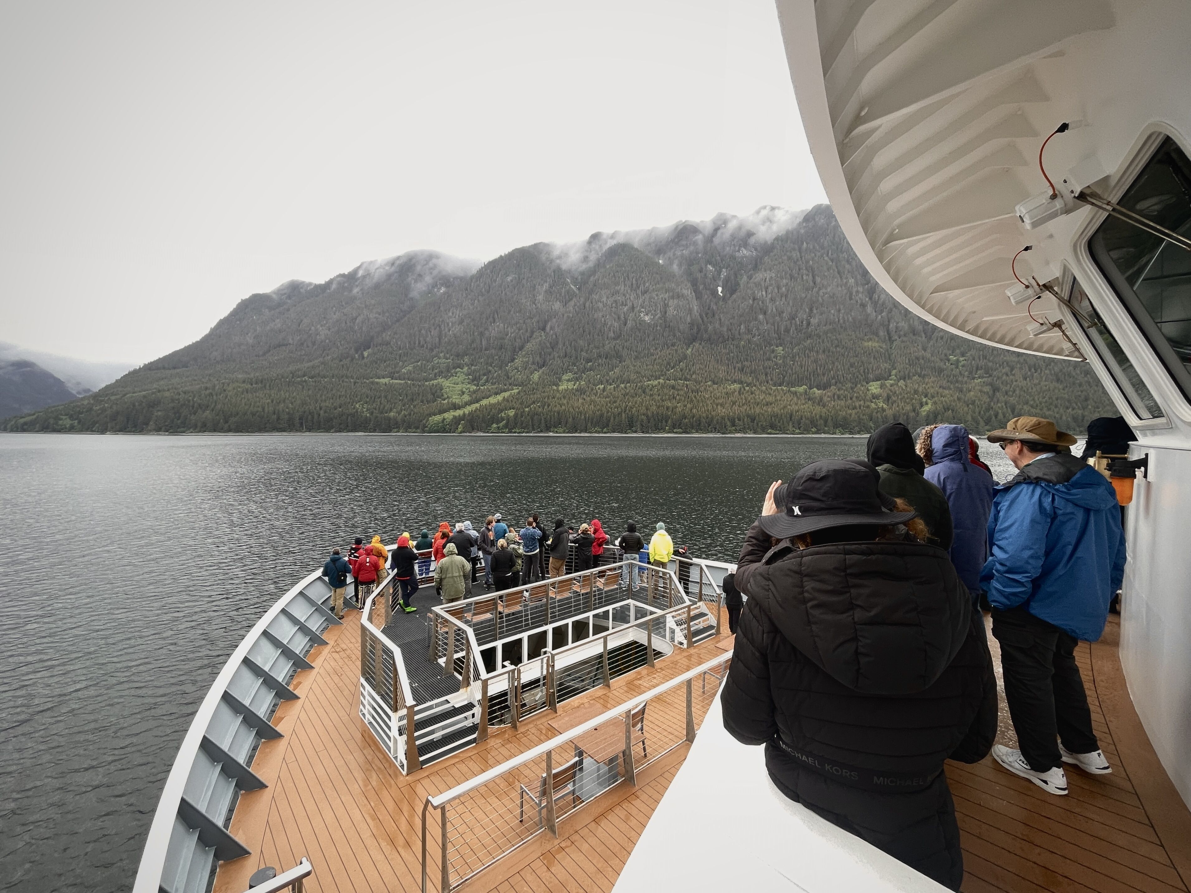 This morning, we were welcomed with true Alaskan weather as we docked in the small Alaskan town of Wrangell located near the mouth of the famous Stikine River. Fortunately, the weather did not prevent us from taking a trip on a jet boat up the fast-moving river to explore the wild interior. After lunch, we headed into town for a very personal and intimate presentation at the Tlingit longhouse of Chief Shakes. It was Sunday, so the town was pretty quiet. The rain took notice and decided to take a rest as well, which was fine with us. We made our way outside to check out Petroglyph Beach and summit Mount Dewy, the imposing hill overlooking the town of Wrangell with inspired views of the surrounding beauty. Looking back, it is hard to believe that we did all this in one day!