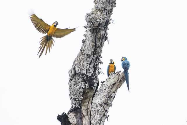 We entered a small black-water tributary known as Belluda Caño to continue our never-ending search for wildlife. Right at its entrance, we found several raptor species: a roadside hawk preening its feathers, a couple of great black hawks looking for fish or a frog to catch and a slate-colored hawk that looked down at us with curiosity. The ubiquitous black-collared hawks couldn't fail to be present and many of them watched us as we slowly passed in front of their perches. A black-tailed trogon too seemed oblivious to our cameras clicking, and a few monk saki monkeys looked at us with early morning, pre-coffee eyes.