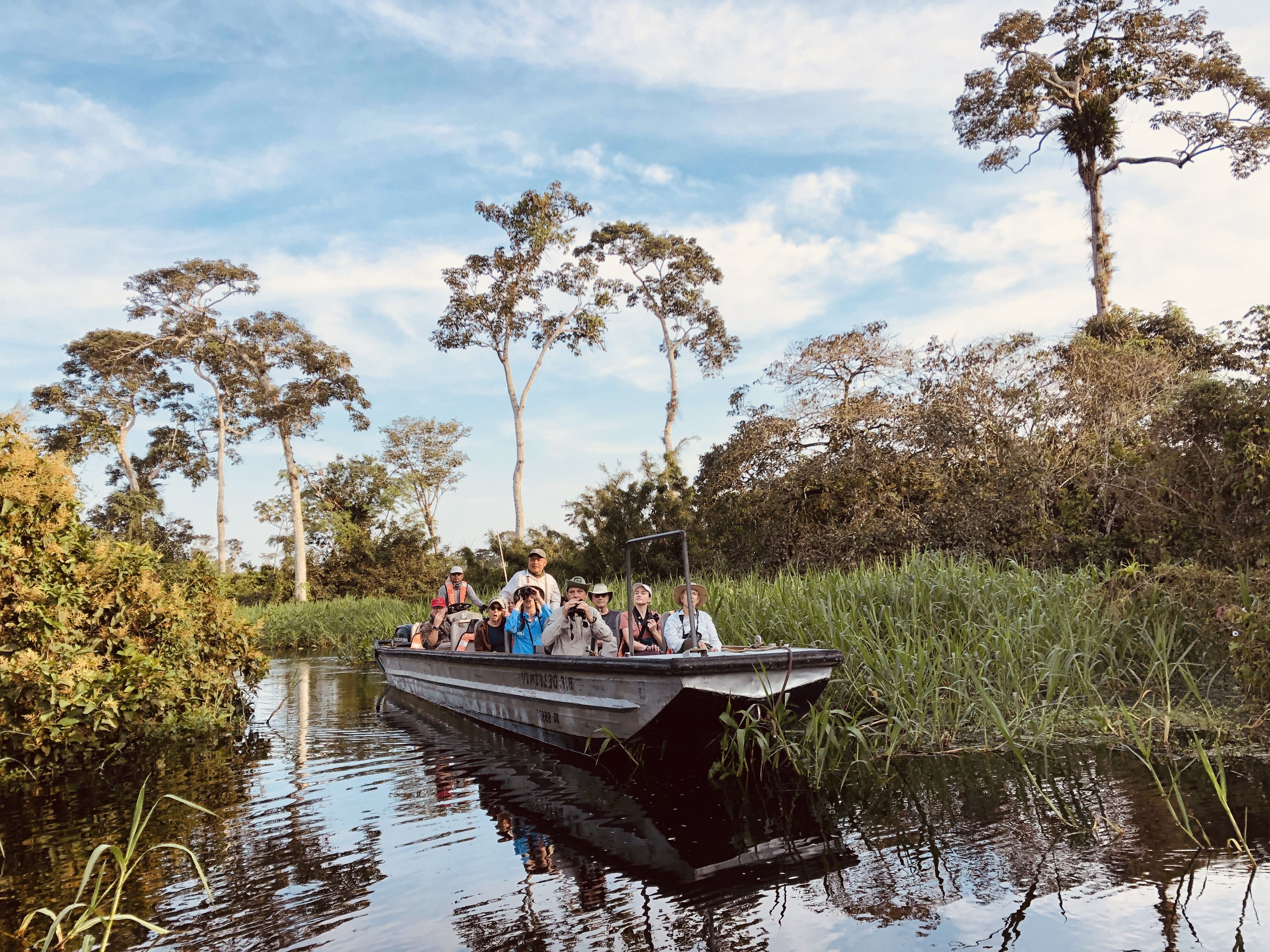 Delfín II continued navigating and entered the Marañón River on her way to our next destination, Nauta Creek. We boarded our skiffs and explored this long and beautiful creek during the evening. We continued enjoying lots of birds, sloths, and monkeys — some species already very familiar and others not so much — and marveled once again at the incredible ability of our naturalists and skiff drivers to find some very elusive creatures like the caiman-lizard! Our very pleasant ride ended with a spectacular double rainbow over the Marañón River, finishing another great day in the Peruvian Amazon.
