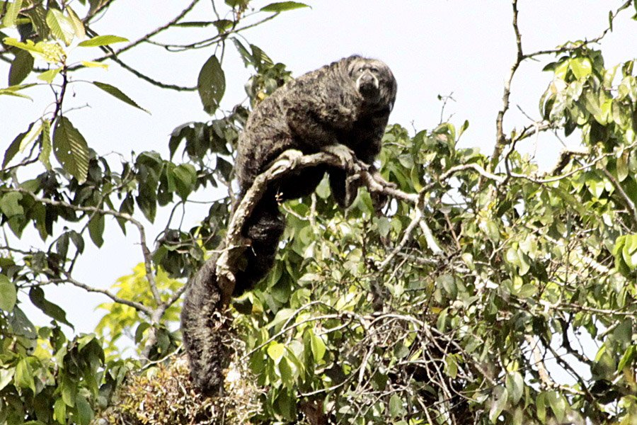 Monk Saki Monkeys (Phiteciamonachus) are generally quiet but when heard they make peculiar calls unexpected in monkeys, they vocalize high pitched whines, grunts and bird-like chirping sounds. This relatively large monkey weights approximately 2.5 Kg (a little less than 6 pounds) but is appears to be bigger due to the thick fur hair that covers most of its body. The thick bushy non-prehensile tail is long and characteristic. It has been suggested that this thick fur, unusual in the tropics, protects the monkeys from insect bites. This monkey species is one of my favorites ever. When travelling, they make acrobatic movements extending its arms just like “flying” from branch to branch. The latter behavior is the origin of one of their common names, “mono volador” which is Spanish for flying monkey.