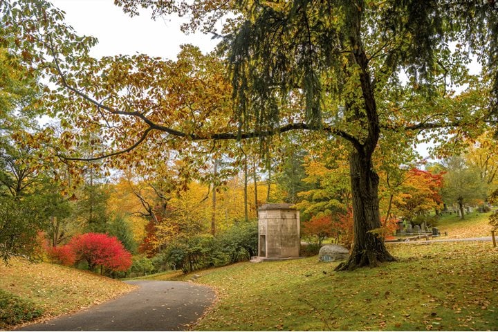 Vibrant leaves surround a Celtic cross in the Sleepy Hollow Cemetery.