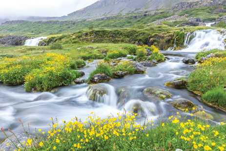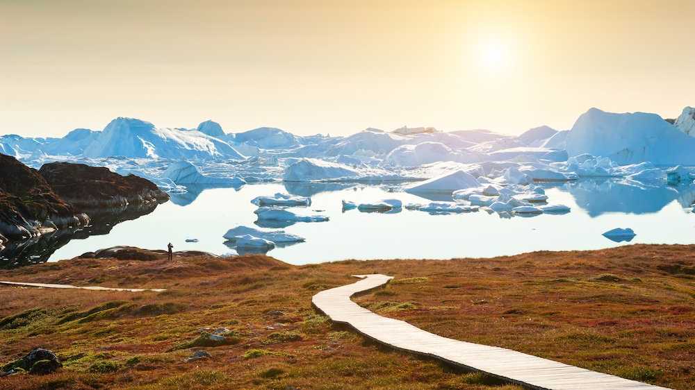 This spectacular fjord extends about 60 miles between one toe of the Greenland ice sheet, at a glacier called Sermeq Kujalleq, and the Arctic coast near the town of Ilulissat. Sermeq Kujalleq is one of the most active glaciers in the world. It can move in the range of 130 feet per day, and it calves an enormous amount of ice into the fjord, which acts like a long, skinny container. The container gets filled up at one end by the glacier, but an underwater shelf of rock and gravel at the other end—near the town and the walking trails—makes it difficult for the ice to escape. The result is an entire channel choked with icebergs throughout the summer and fall. From a lookout at the end of a sturdy boardwalk, you can gaze straight ahead and see nothing but sculptures of ice.