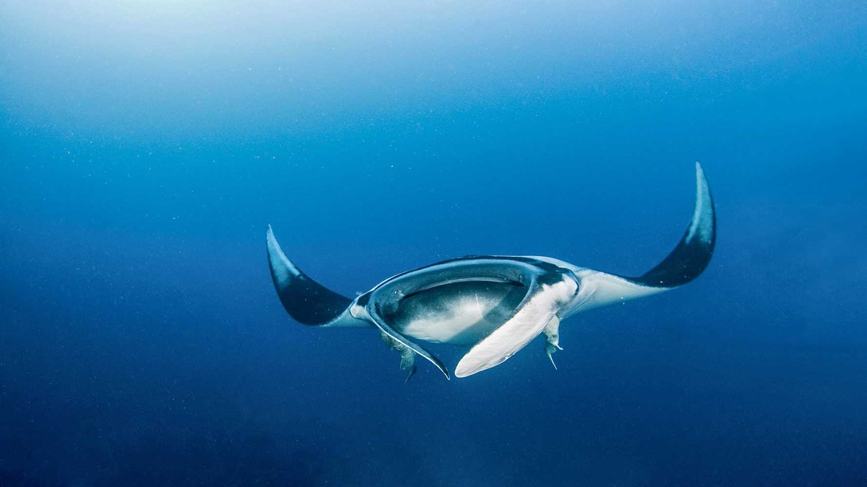 These graceful and efficient swimmers (they move around 9 miles per hour and can reach bursts of 22 mph) could easily migrate vast distances across the open ocean, but recent research has found that they often travel just a few hundred miles, remaining within specific subpopulations in regions like the South Pacific, Ecuador, and Bali. Rather than relocate long distances to follow a food source, the way most large ocean creatures do, giant mantas stay put and adjust their meals to what’s around them—zooplankton, large shrimp, even small fish. Their habitat and feeding grounds often overlap with that of their smaller relative: the more coastal reef manta ray, M. alfredi, whose wingspan reaches up to 18 feet.